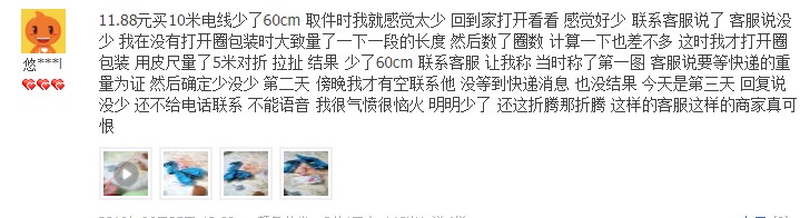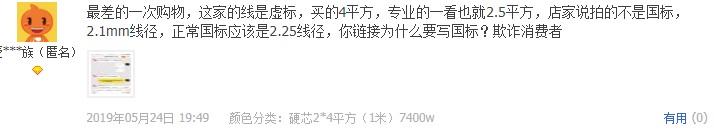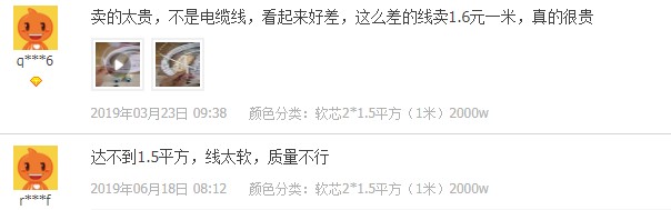 評價截圖有很多,我這邊就不一 一發(fā)出來了,總結(jié)幾個特征,冒充國標(biāo),截面積虛標(biāo),米數(shù)不足,導(dǎo)體斷線,鋁鍍銅,這個就是低價的本質(zhì),如果你是買回家當(dāng)擺設(shè)并且不怕刺鼻味的,盡可能多買點,其余用途作為晾衣繩都怕斷。